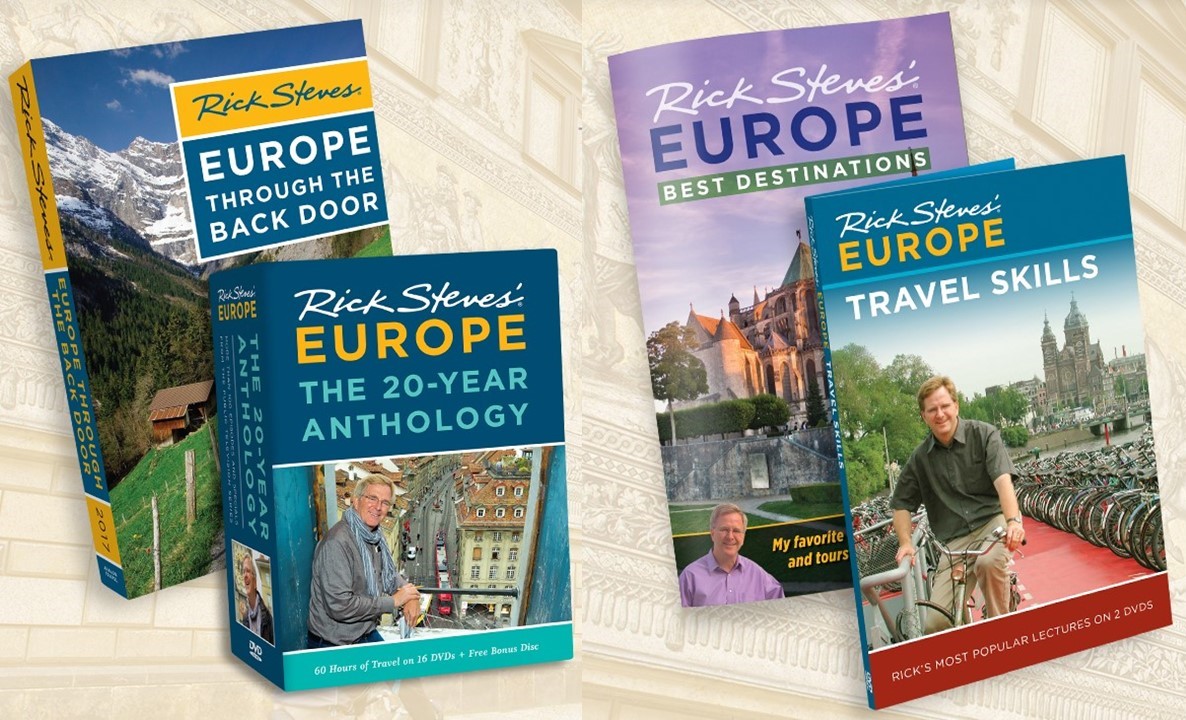 This prepackaged kit includes the Rick Steves’ Europe Through the Back Door Guidebook (Current Edition) paperback book, Rick Steves’ Europe: Complete 20 Year Anthology (17-DVD Set), Rick Steves Travel Skills 2-DVD set and the Best Destinations Newsletter.