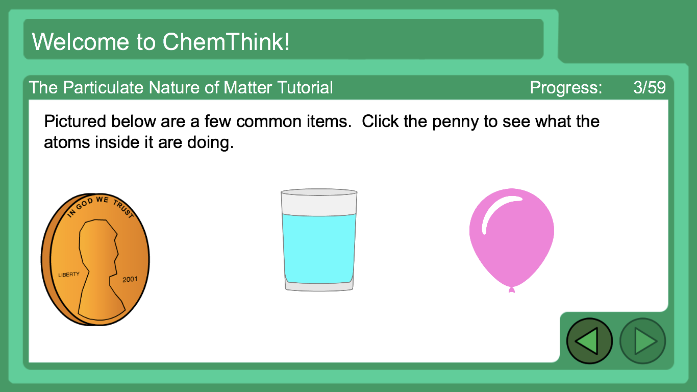 In this interactive activity from ChemThink, learn about solids, liquids, and gases at an atomic level. Investigate how the behavior and interaction of atoms and molecules account for the states of matter. Important terms such as elements, molecules, compounds, and mixtures are also reviewed.