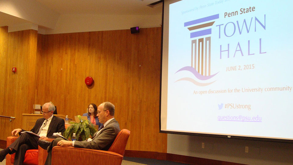 Executive Vice President and Provost Nick Jones and Senior Vice President for finance and business David Gray speak with Penn State staff and faculty.